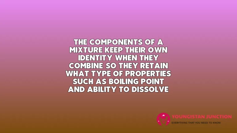 QuestionThe components of a mixture keep their own identity when they combine, so they retain what type of properties, such as boiling point and ability to dissolve?Know MoreThe components of a mixture keep their own identity when they combine, so they retain what type of properties, such as boiling point and ability to dissolve?Youngistan JunctionJune 20, 2025